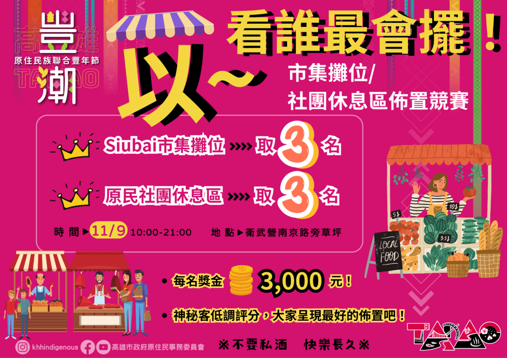「Siubai咻百市集」集結逾百攤位,提供美食、文創、烤豬等,並安排不間斷的舞台活動。市集內,民眾可參加抽獎活動,還有「TAKAO一級伴」伴手禮大賽的現場票選,挑選出優秀的高雄原民伴手禮。隨著夜幕降臨,金曲歌王王宏恩與歌后舞思愛將為晚會帶來壓軸演出,掀起活動高潮。